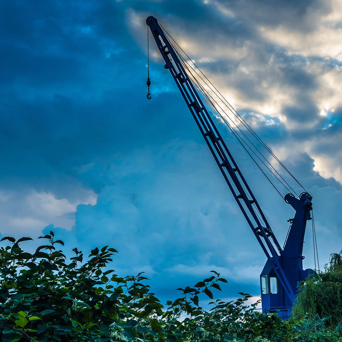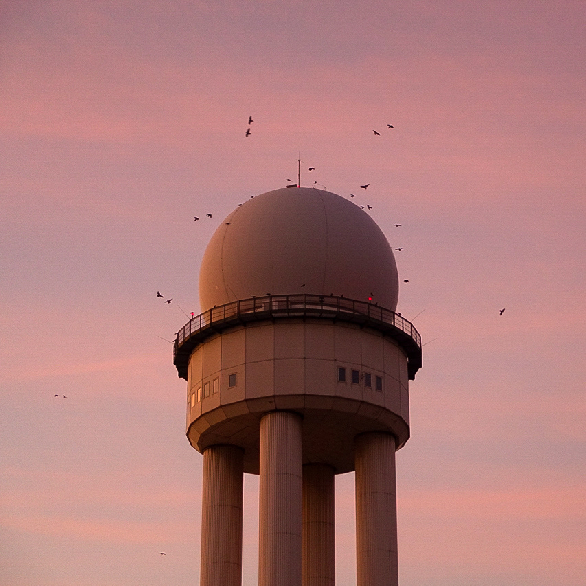 Strausberger Platz, Shell-Haus, Philharmonie, Tempelhofer Feld, Königstädtische Dampf-Wasch-Anstalt, Warschauer Brücke am Morgen mit Mond, "Der blaue Kran" - Rummelsburger See